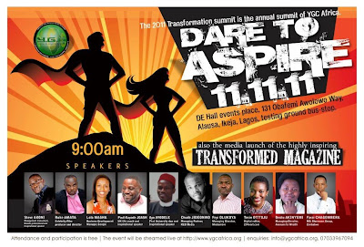 It’s a special one!: 11/11/11. The 2011 Transformation Summit is the annual summit of YGC Africa. This year's summit is themed "DARE TO ASPIRE" and it will feature some of the finest personalities Africa has to offer, people that have gone beyond limitations to become world class people of Impact.