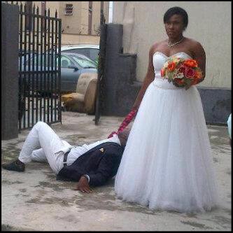 5. Something funny is happening here. May be the man is drunk and misbehaved so the wife decided to drag him to the alter.