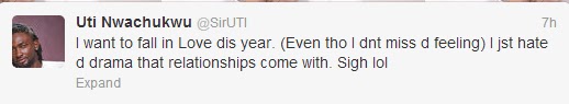 The Big Brother star game winner is kind of scared of love because of the 'drama' involved, but he wants to give it a try this year. Check out his love-related tweets with a lady below...
