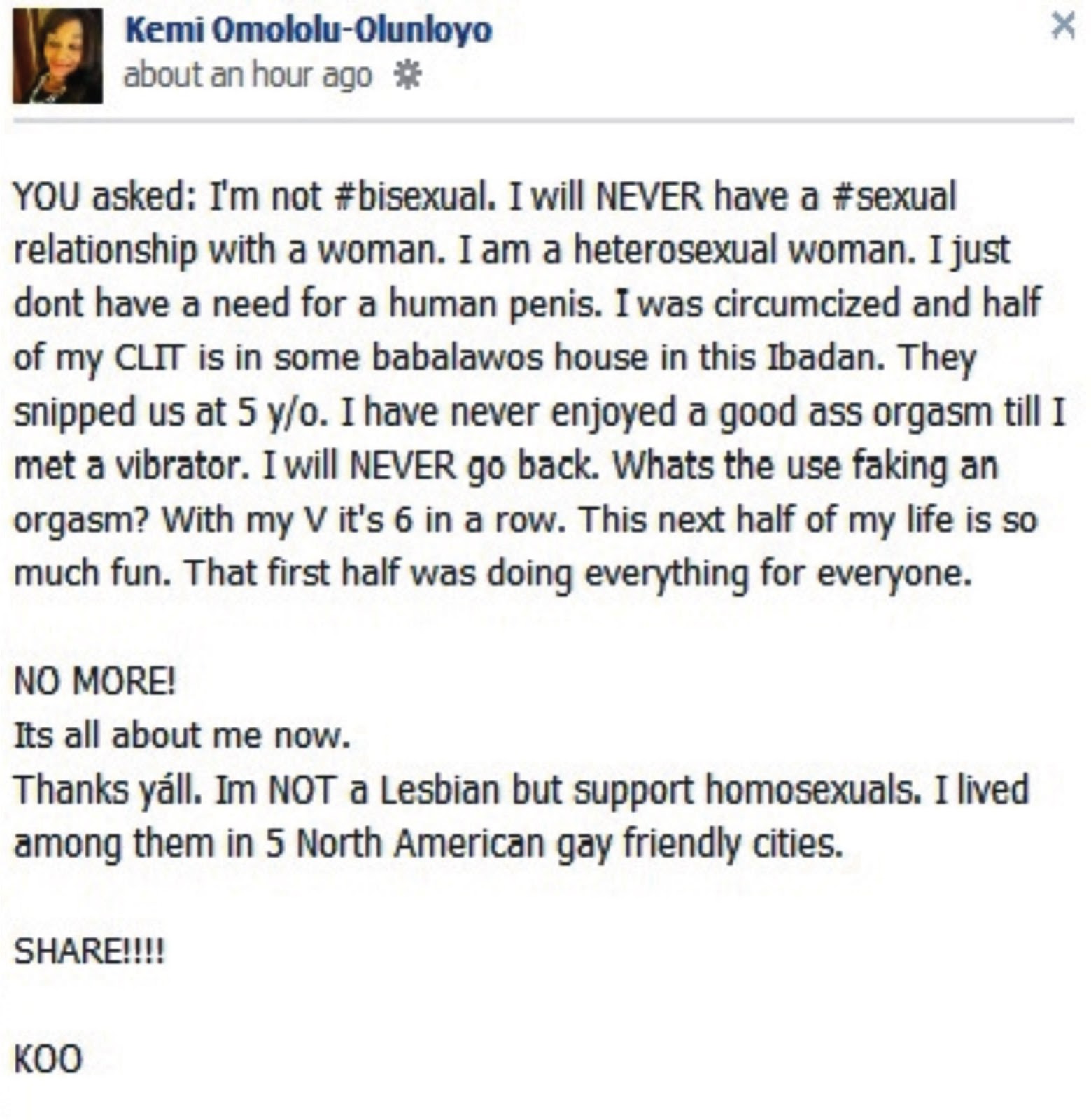 I said it before, Ms Kemi Olunloyo really needs some form of spiritual help. It appears no man is interested in her anymore in Ibadan because of her negative ways. Now she's claiming no man can satisfy her sexually so she has settled for a different kind of penis. See her shameless revelation below...