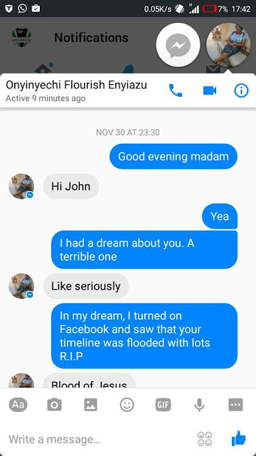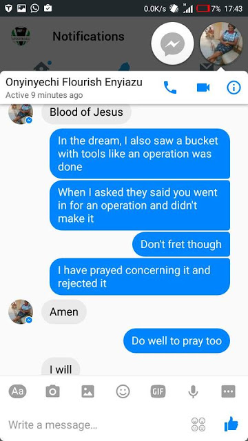 "It's really unfortunate that the spiritual controls the physical. John Kpoobari Diidi had a revelation about Onyinyechi Flourish Enyiazu, he inboxed her and they had the conversations. Who would have thought the dream was going to be real? Yesterday she uploaded that she had a successful surgery and today she is no more, that revelation John had has come to pass