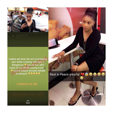 This beautiful lady, who's based in Lagos, was reportedly killed in a gas explosion in the kitchen as she was operating her phone while cooking...