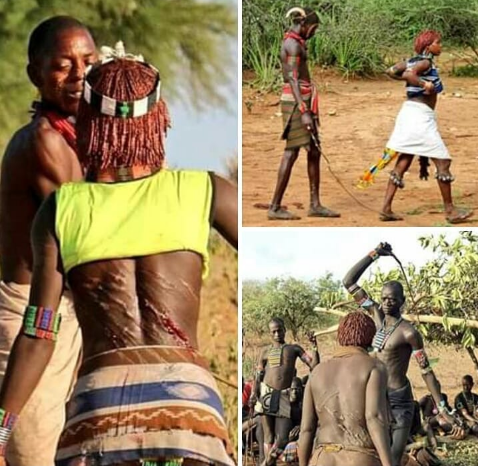 Who invented this kind of culture and to achieve what purpose? Women from the Hamar tribe in Ethiopia are whipped to show their love for men going through Rite of Passage ceremony. The beatings go on until their backs turn bloody. They are not allowed to scream.